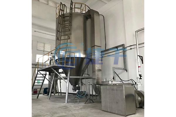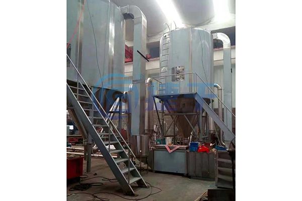 空气经过过滤和加热,进入干燥器顶部空气分配器,热空气呈螺旋状均匀地进入干燥室。料液经塔体顶部的高速离心雾化器,(旋转)喷雾成极细微的雾状液珠,与热空气并流接触,在极短的时间内可干燥为成品。成品连续地由干燥塔底部和旋风分离器中输出,废气由风机排空。