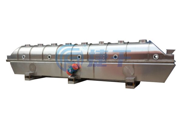物料自进料口进入机内,在振动力作用下,物料沿水平流化床抛掷,向前连续运动,热风向上穿过流化床同湿物料换热后,湿空气经旋风分离器除尘后由排风口排出,干燥物料由排料口排出。